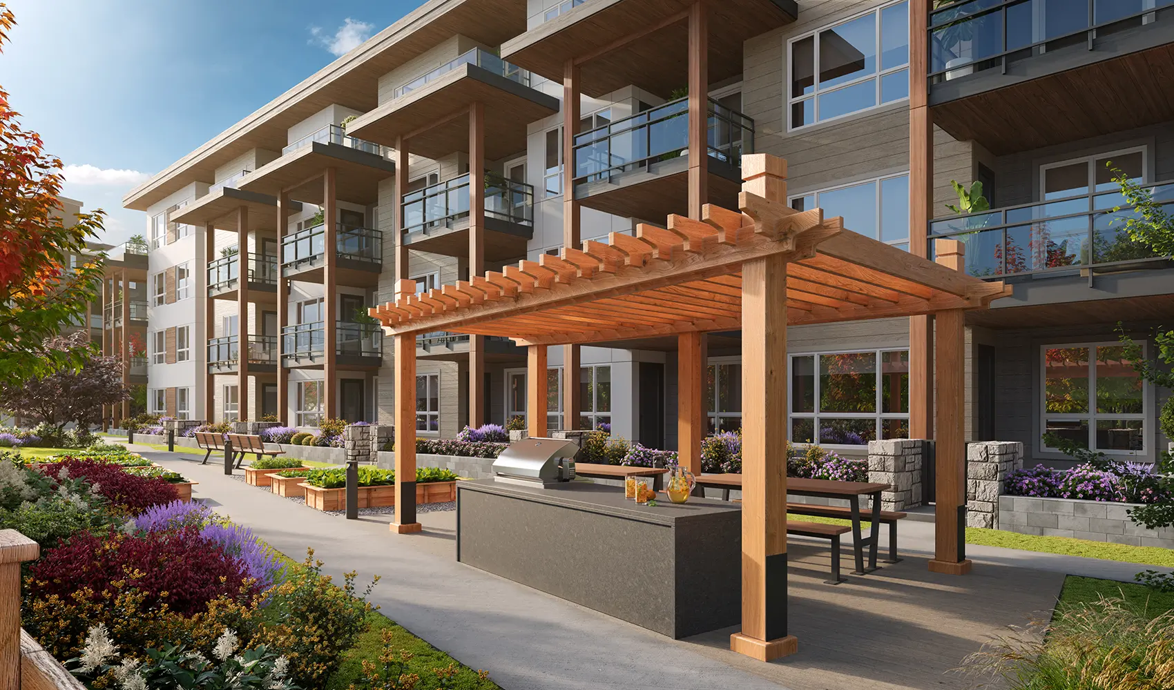 Lush landscaping includes community vegetable plots and an outdoor dining area.